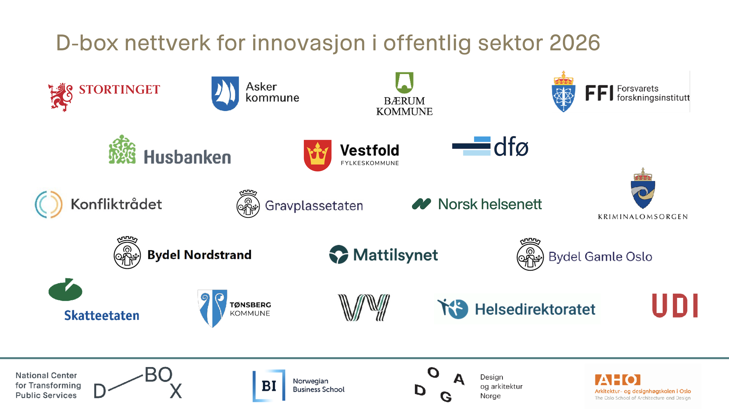 D-box er et senter for innovasjon i offentlig sektor som eies av Arkitektur og designhøyskolen i Oslo (AHO), Handelshøyskolen BI og Design og arkitektur Norge (DOGA). I år har vi fått med oss 20 kommuner, bydeler, kommunale etater, fylkeskommuner og statlige virksomheter. Det er virksomheten som er medlemmer (ikke enkeltpersoner) og de kan stille med inntil fire personer på hvert nettverkssamling. Det skal gjøre det enklere å ta i bruk det de har lært i nettverket i egen organisasjon.