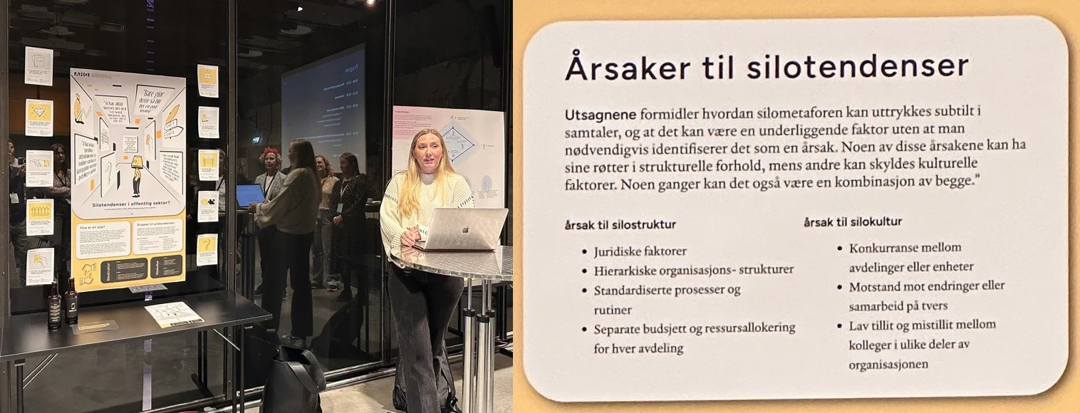 Et annet prosjekt valgte å utforske et begrep som ofte blir nevnt når man snakker om offentlig sektor: silo. De stilte spørsmål som: Hva er en silo? Og hva forårsaker silotendenser? På en plakat basert på «ekte innsikt, fiktive utsagn og en god dose antakelser» fikk vi presentert flere sitater som illustrer silotendenser.